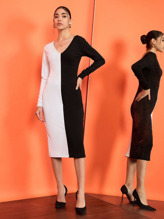Ribbed Dual Tone Full Sleeves Bodycon Dress